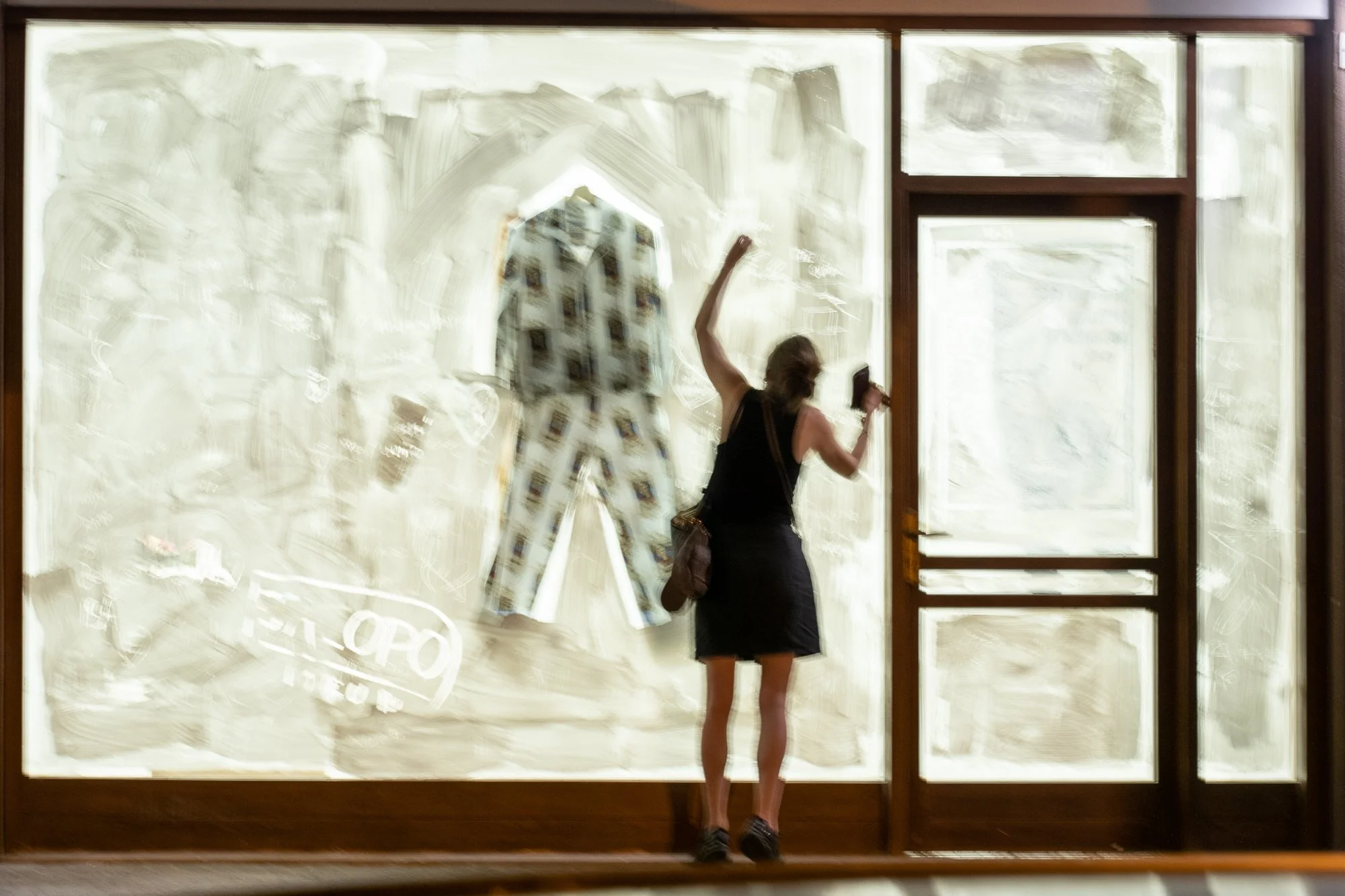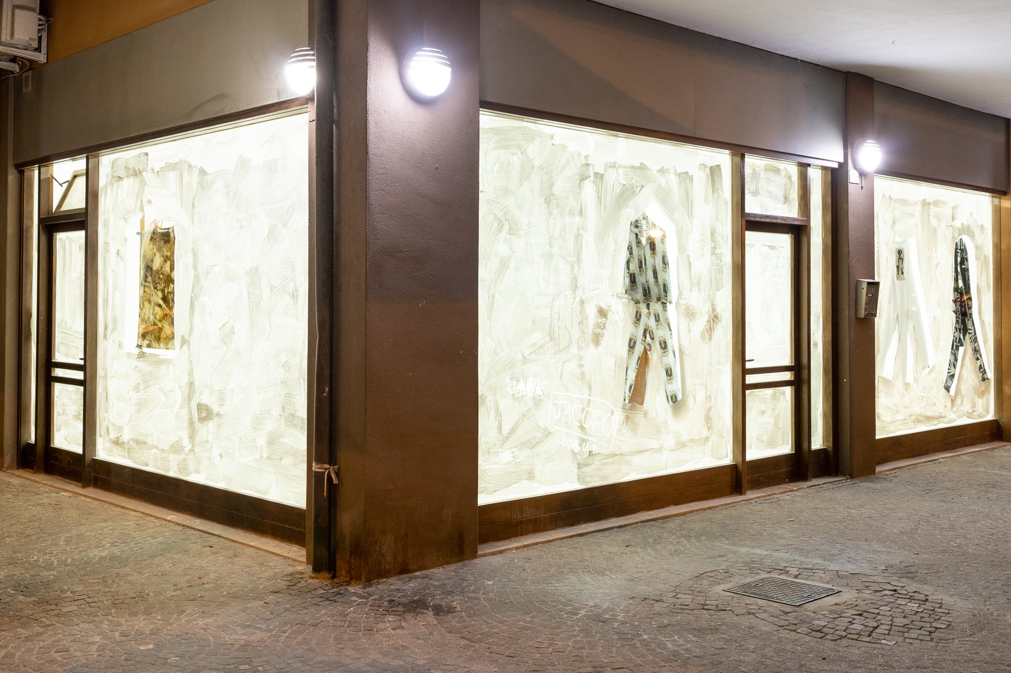 At the invitation of Paul Renner, parts of the edition will be publicly displayed in the summer/fall of 2025 in the whitewashed shop windows of his studio and exhibition space La Vetrina in the harbor of Porto Santa Margherita. There, the pajamas hang like fleeting figures; defining the negative spaces of the whitened windows. From the outside, the glass surface functions like a giant guest book—one that, in fact, no one really knows about, except the passers-by who leave their scribbles.